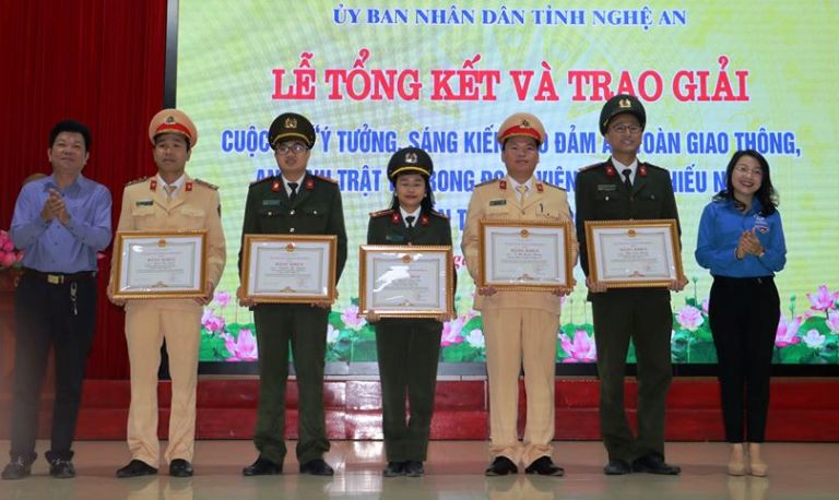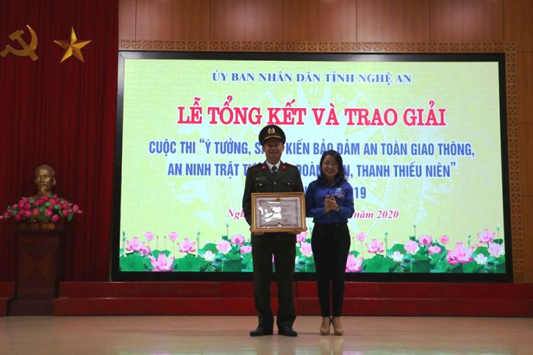 Đồng chí Nguyễn Thị Thơm - Quyền Bí thư Tỉnh đoàn trao giải Nhất tập thể cho Đoàn Thanh niên Công an tỉnh Nghệ An