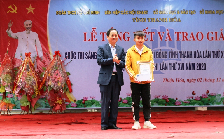 Đ/c Nguyễn Quốc Uy, Phó Chủ tịch Liên hiệp các Hội KH&KT tỉnh trao giải nhất cho em Nguyễn Công Phong, Trường THPT Thiệu Hóa, huyện Thiệu Hóa, với mô hình Xe đẩy xúc hạt đa năng.