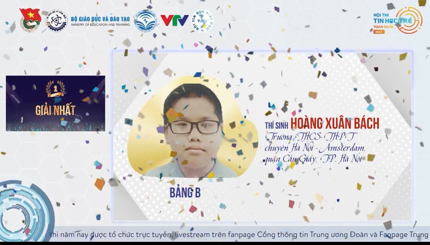 Bảng B (bảng thi kỹ năng lập trình dành cho học sinh THCS) năm nay có 2 giải nhất và được trao cho thí sinh Phạm Công Minh (Trường THCS Phan Chu Trinh, Q.Ba Đình, TP.Hà Nội) và thí sinh Hoàng Xuân Bách (Trường THCS-THPT chuyên Hà Nội - Amsterdam, Q.Cầu Giấy, TP.Hà Nội).