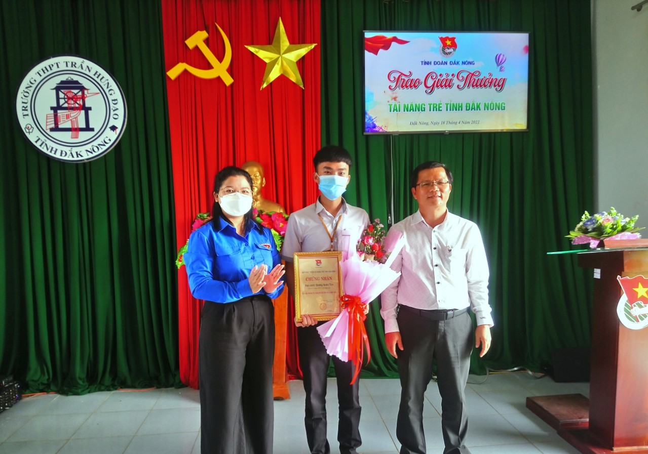 Tại Trường THPT Trần Hưng Đạo (Đắk Mil), đồng chí H’Hồng – Phó Bí thư Tỉnh đoàn, Chủ tịch Hội đồng Đội tỉnh đã trao Giải thưởng cho 01 em học sinh đạt giải tại Kỳ thi chọn học sinh giỏi quốc gia THPT, năm học 2021 - 2022.