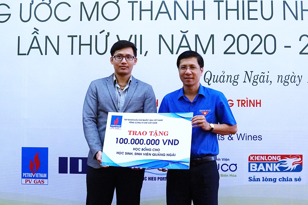 Bí thư Tỉnh đoàn Đặng Minh Thảo nhận bảng tượng trưng học bổng dành tặng riêng cho học sinh xã Ba Nam (huyện miền núi Ba Tơ) từ nhà tài trợ