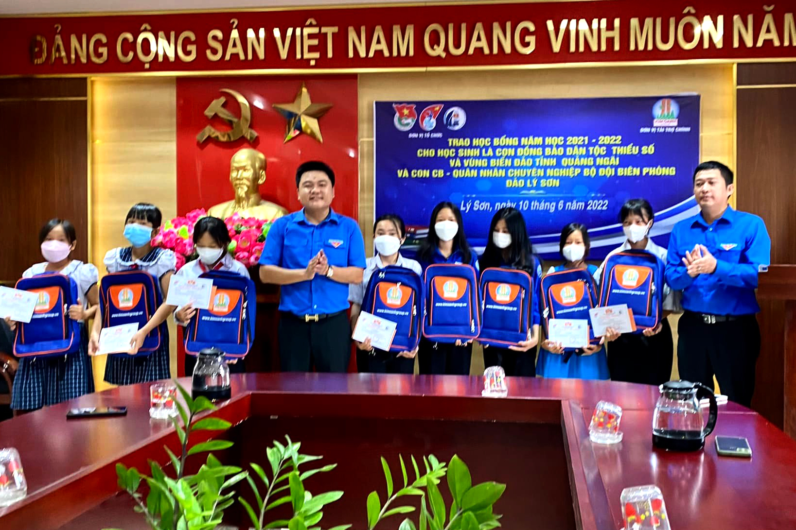 Bí thư Tỉnh đoàn Cao Lê Tùng Nghĩa và Phó Bí thư Tỉnh đoàn Trần Đăng Minh trao học bổng cho các em học sinh ở huyện đảo Lý Sơn.