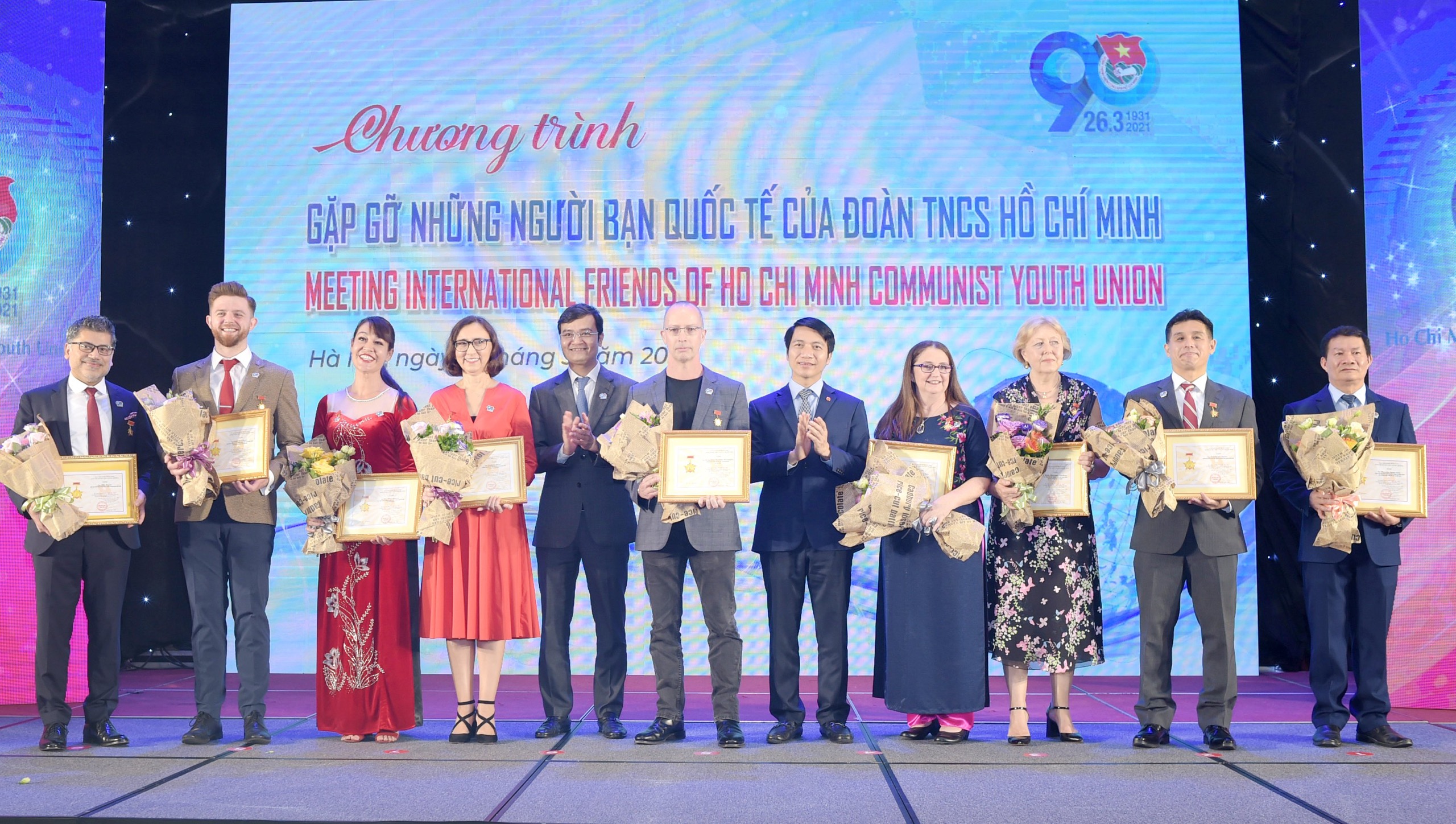 Đồng chí Hoàng Bình Quân- Nguyên UVTW Đảng, nguyên Trưởng Ban đối ngoại Trung ương, nguyên Bí thư thứ nhất Trung ương Đoàn và đồng chí Nguyễn Anh Tuấn- Ủy viên Trung ương Đảng, Bí thư thứ Nhất Trung ương Đoàn, Chủ tịch Hội LHTN Việt Nam trao kỷ niệm chương "Vì thế hệ trẻ" cho các cá nhân nước ngoài có nhiều đóng góp cho công tác phát triển thanh thiếu nhi Việt Nam