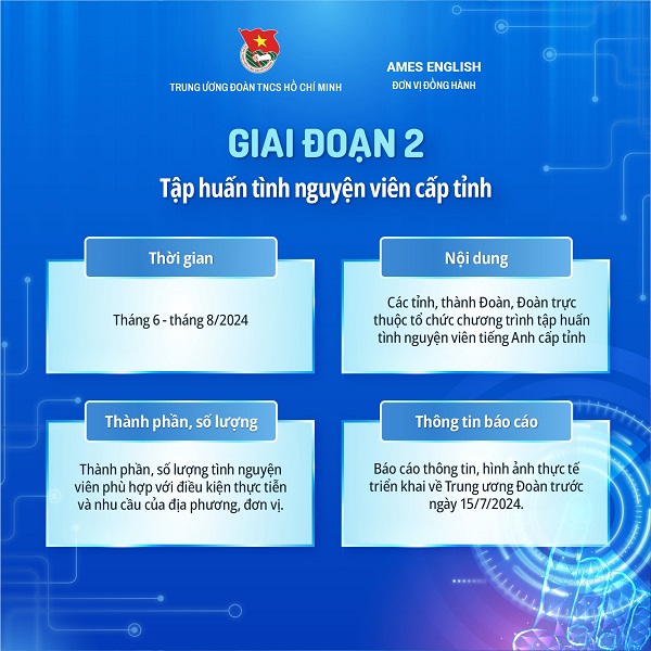 Giai đoạn 02 sẽ tiến hành tập huấn tình nguyện viên cấp tỉnh - huyện do tỉnh, thành Đoàn, Đoàn trực thuộc tổ chức. Theo đó, mỗi Đoàn cấp huyện hoặc tương đương lựa chọn 01 đại diện trở thành huấn luyện viên tiếng Anh cấp tỉnh, sau đó phối hợp với Huấn luyện viên cấp tỉnh đã được huấn luyện ở Giai đoạn 1 (cấp Trung ương) hoặc các Trung tâm Anh ngữ ở địa phương để triển khai nội dung tập huấn tương tự với mô hình, kiến thức đã được Trung ương Đoàn huấn luyện, hướng dẫn.