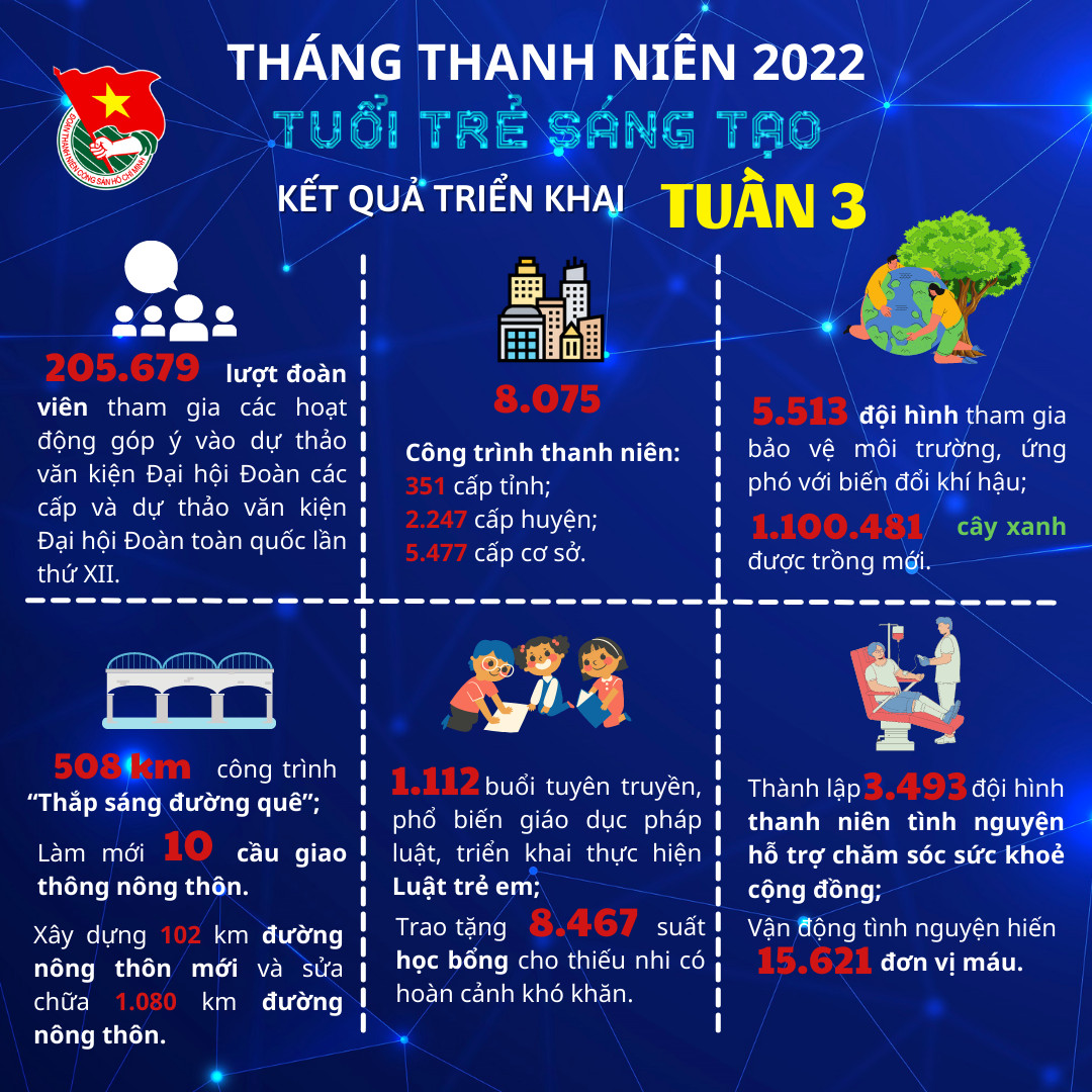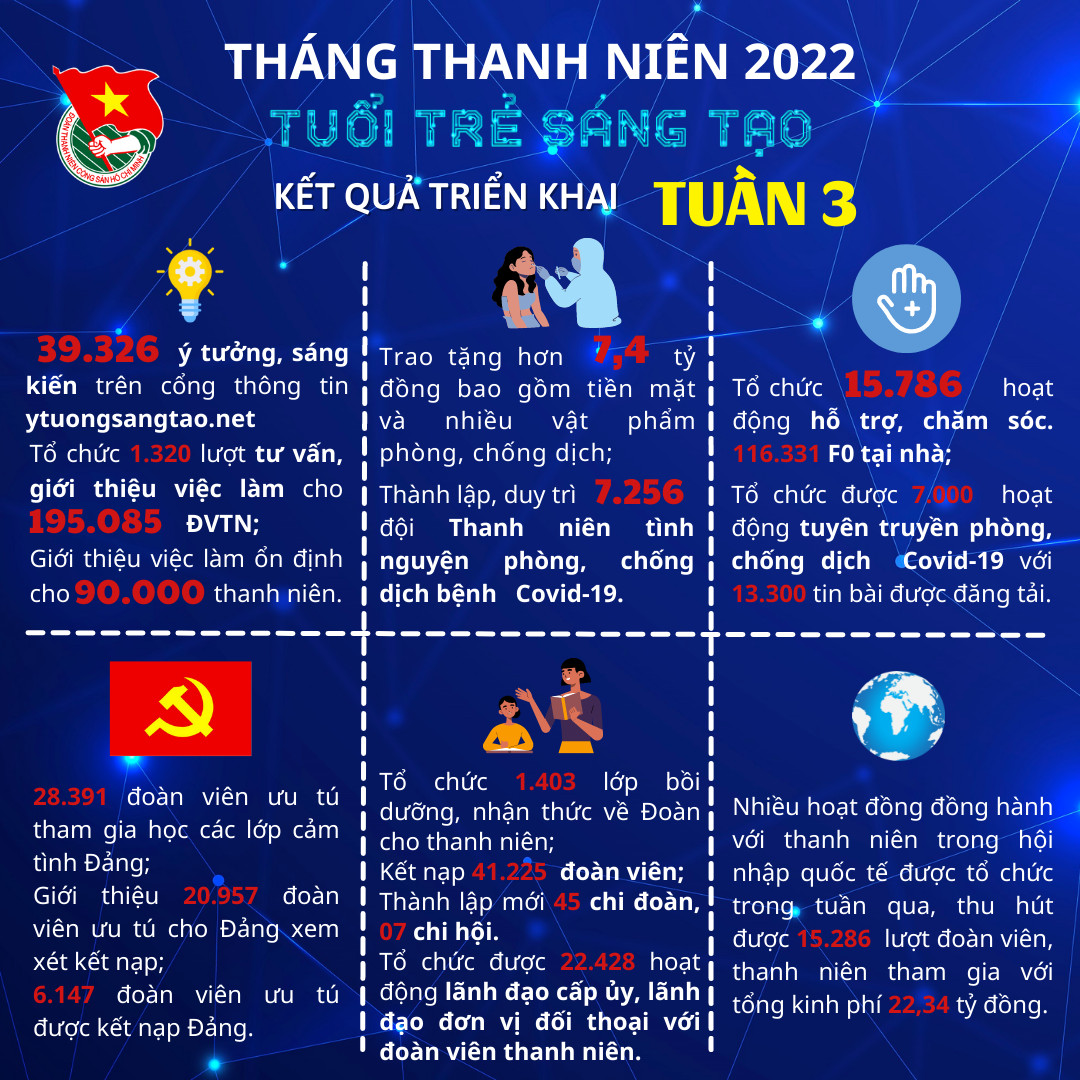 Bên cạnh đó, trong tuần 3 các cấp bộ Đoàn đã vận động đoàn viên, thanh niên đề xuất 39.326 ý tưởng, sáng kiến trên cổng thông tin ytuongsangtao.net của Trung ương Đoàn. Tổ chức 118 cuộc thi tìm kiếm ý tưởng sáng tạo của đoàn viên, thanh niên, thu về 4.772 ý tưởng, sản phẩm tham gia. Có 13.628 hội thảo, toạ đàm, diễn đàn sáng tạo trẻ được tổ chức với 19.630 lượt đoàn viên, thanh niên tham gia. Cũng trong tuần 03 đã có 1.194 ý tưởng của thanh niên được hỗ trợ triển khai thực hiện;