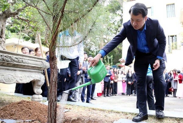 Đồng chí Bùi Quang Huy trồng cây trong khuôn viên cơ quan Trung ương Đoàn, hưởng ứng Tết trồng cây Xuân Ất Tỵ 2025. Ảnh: Lâm Đăng Hải
