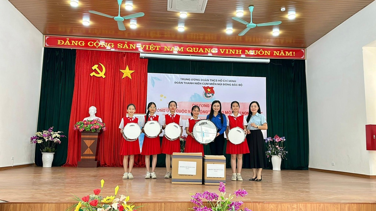 Bí thư T.Ư Đoàn, Chủ tịch Hội đồng Đội T.Ư Nguyễn Phạm Duy Trang trao tặng 01 bộ trống Đội cho Ban Chỉ huy Liên đội trường THCS Bắc Kạn