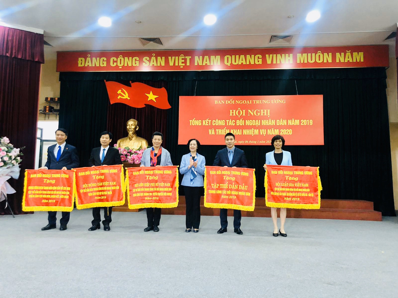 Đồng chí Trương Thị Mai - Ủy viên Bộ Chính trị, Bí thư Trung ương Đảng, Trưởng Ban Dân vận Trung ương trao cờ thi đua cho các đơn vị có thành tích xuất xắc trong công tác đối ngoại nhân dân năm 2019