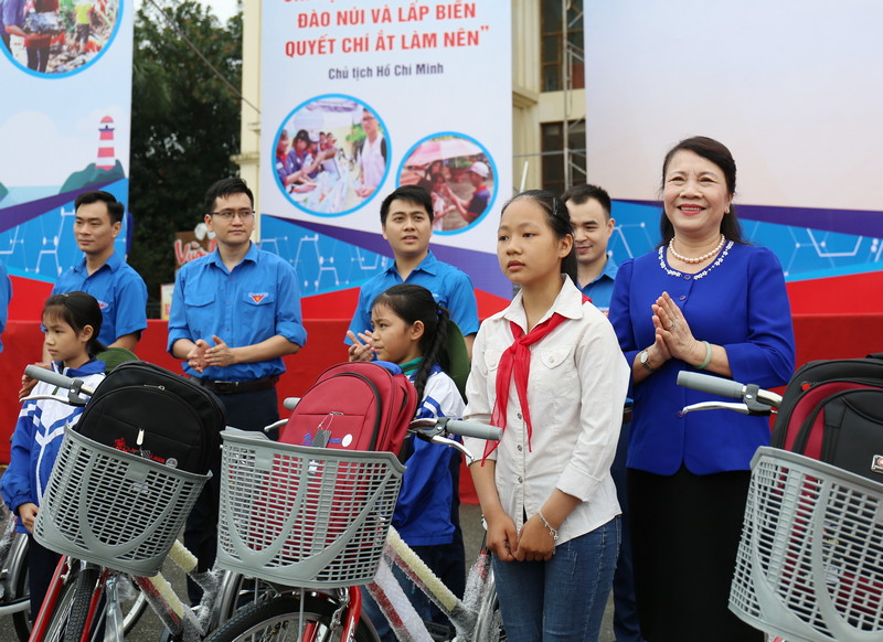 Thứ trưởng Bộ Giáo dục và Đào tạo Nguyễn Thị Nghĩa trao tặng xe đạp cho học sinh nghèo vượt khó tại lễ ra quân