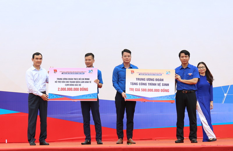 Bí thư TƯ Đoàn, Chủ tịch Hội đồng Đội Trung ương Nguyễn Ngọc Lương (bên trái) trao tặng các công trình thanh niên thực hiện trong Chiến dịch