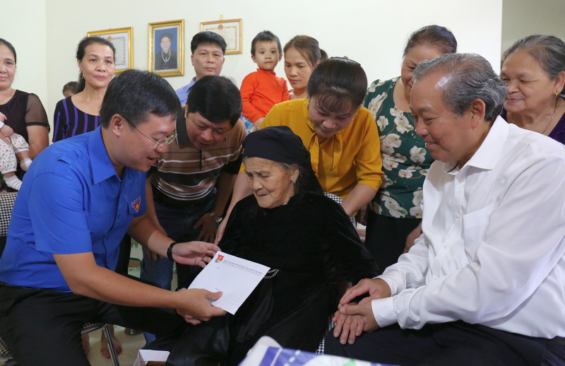 Phó Thủ tướng thường trực Chính phủ Trương Hòa Bình và Bí thư thứ nhất T.Ư Đoàn Lê Quốc Phong tặng quà cho các gia đình chính sách...