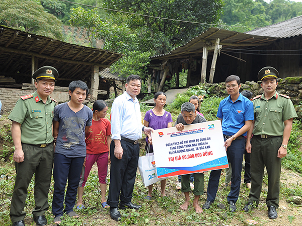 Bí thư TƯ Đoàn, Chủ tịch Hội Sinh viên Việt Nam Bùi Quang Huy tặng biển tượng trưng xây dựng nhà nhân ái cho gia đình ông Đặng Phú Tiến.