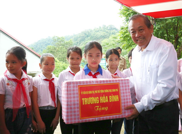 Phó Thủ tướng Thường trực Trương Hòa Bình tặng quà cho các em thiếu nhi xã Dương Phong, huyện Bạch Thông.