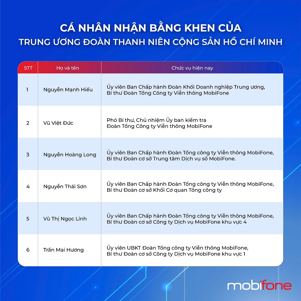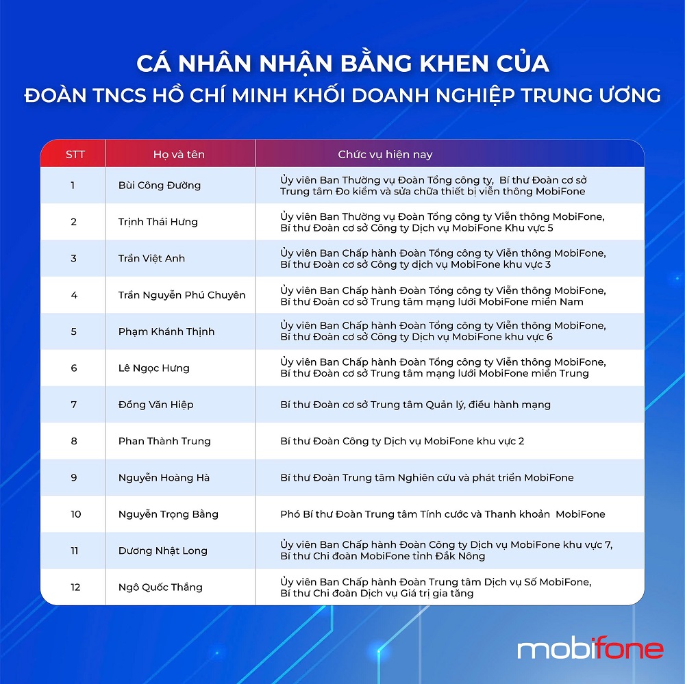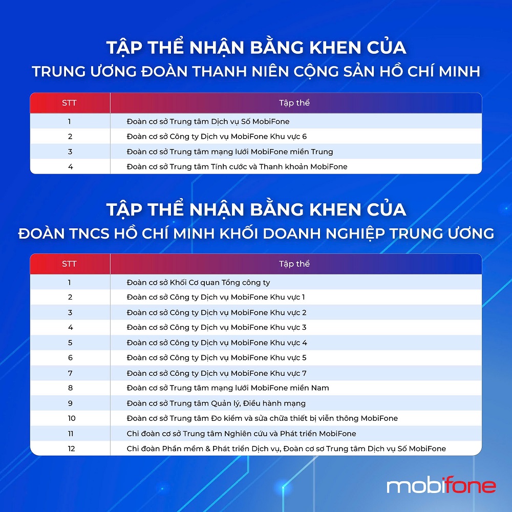 Trong đó, đơn vị xuất sắc dẫn đầu công tác Đoàn và phong trào thanh niên năm 2024 của Tổng công ty là: Đoàn TNCS Hồ Chí Minh Trung tâm Mạng lưới MobiFone miền Nam;