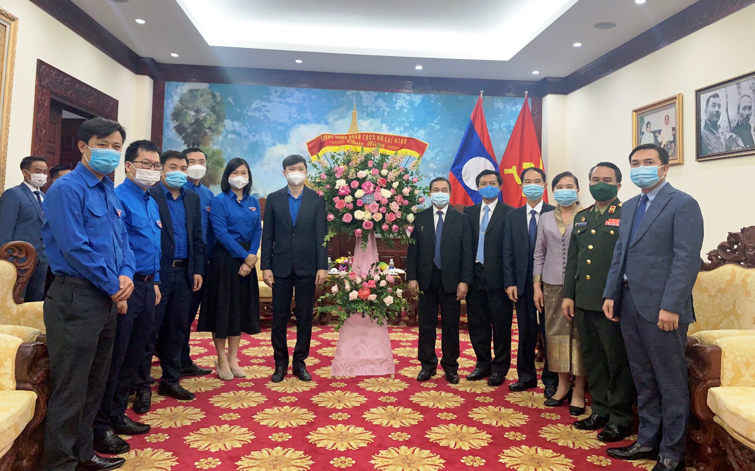 Đồng chí Nguyễn Minh Triết - Bí thư Trung ương Đoàn, Phó Chủ tịch Thường trực Trung ương Hội Sinh viên Việt Nam cùng lãnh đạo các Ban, đơn vị Trung ương Đoàn tặng hoa chúc mừng Đại sứ quán Lào tại Việt Nam