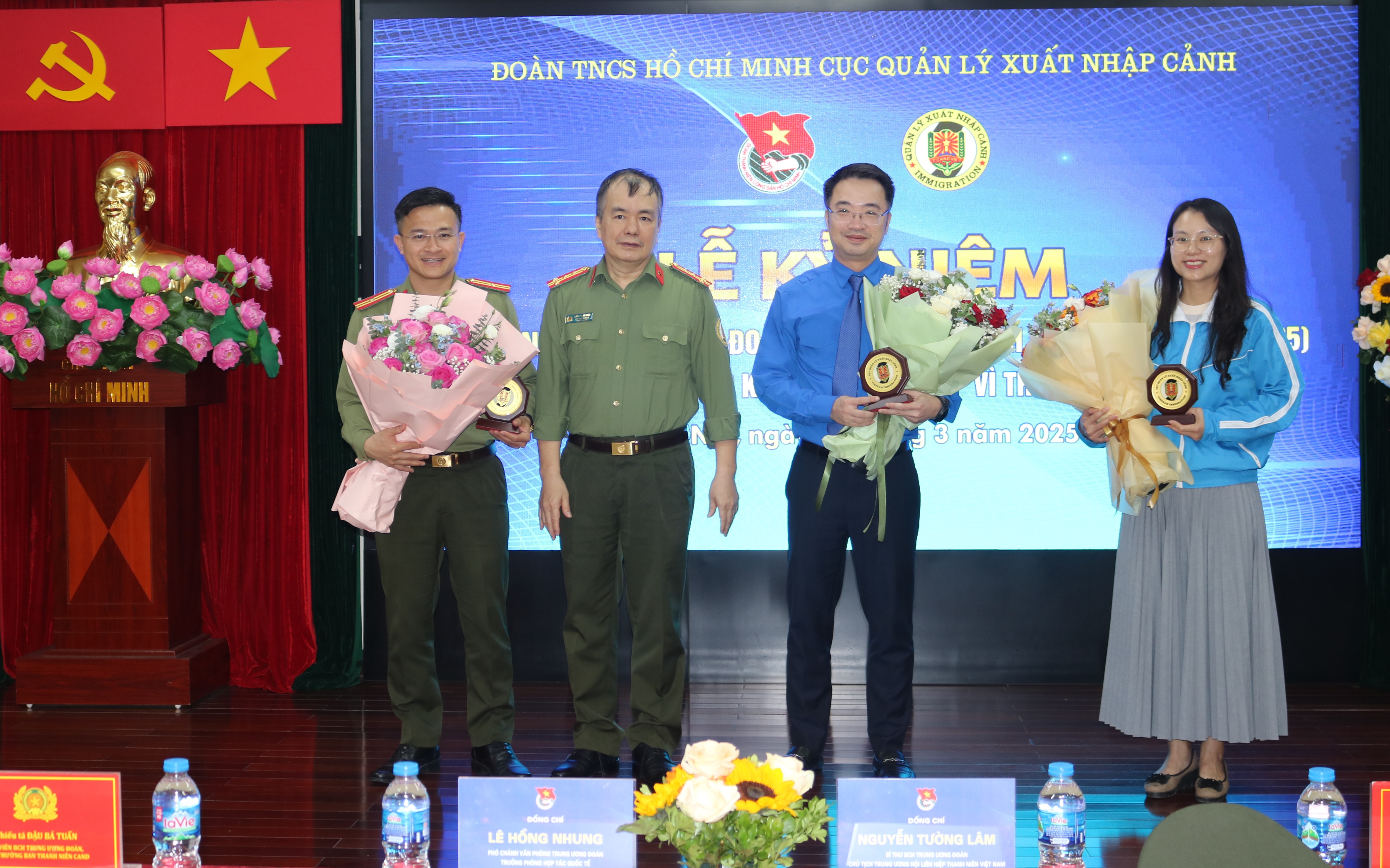 Lãnh đạo Cục Quản lý xuất nhập cảnh tặng hoa chúc mừng đồng chí Nguyễn Tường Lâm nhân kỷ niệm 94 năm Ngày thành lập Đoàn TNCS Hồ Chí Minh