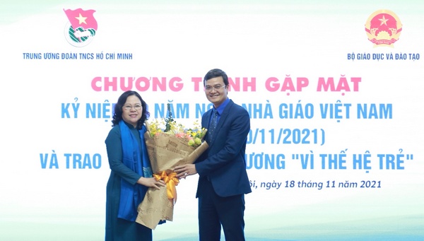 Đồng chí Bùi Quang Huy, Bí thư thường trực Trung ương Đoàn tặng hoa chúc mừng đồng chí Ngô Thị Minh nhân dịp kỷ niệm 39 năm Ngày Nhà giáo Việt Nam