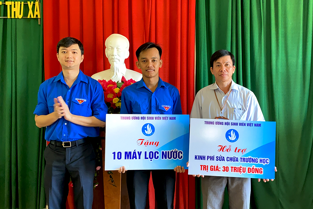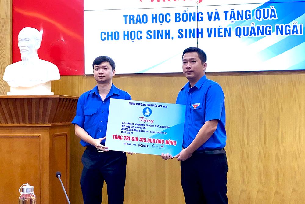 Anh Nguyễn Minh Triết, Ủy viên Ban Thường vụ Trung ương Đoàn, Phó Chủ tịch Thường trực Hội Sinh viên Việt Nam (bìa trái) trao bảng tượng trưng quà tặng tỉnh Quảng Ngãi trị giá 415 triệu đồng cho anh Cao Lê Tùng Nghĩa, Phó Bí thư Thường trực Tỉnh đoàn, Chủ tịch Hội Sinh viên Việt Nam tỉnh Quảng Ngãi