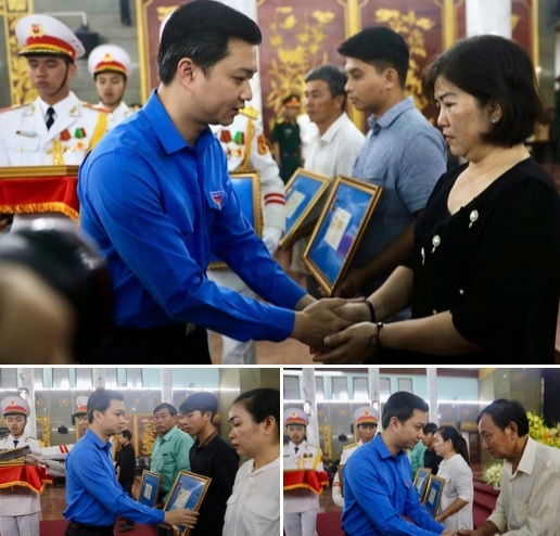 Đồng chí Nguyễn Minh Triết - Bí thư Trung ương Đoàn, Chủ tịch Trung ương Hội Sinh viên Việt Nam trao Huy hiệu Tuổi trẻ dũng cảm đến thân nhân các liệt sĩ. Ảnh: Duy Anh