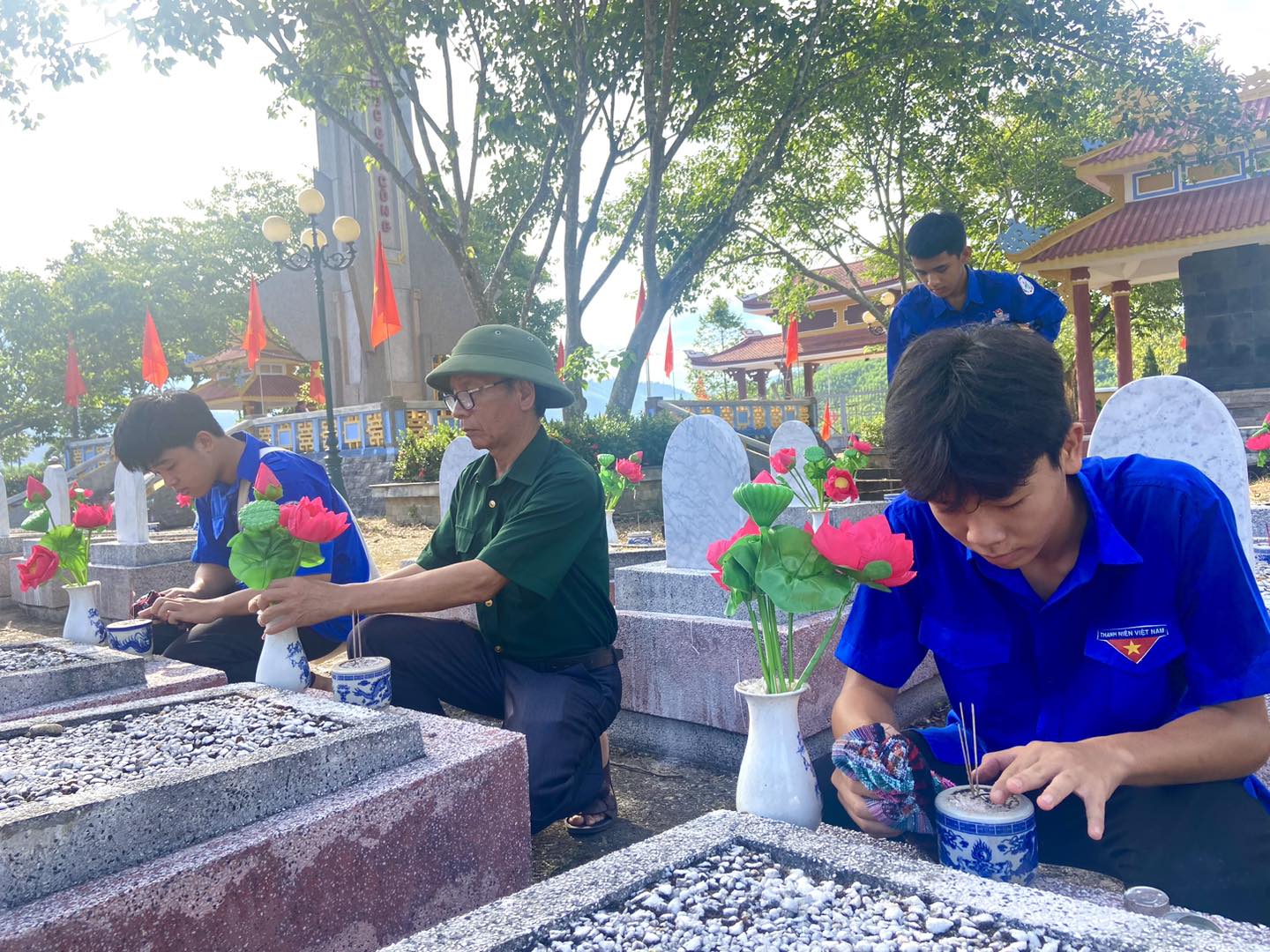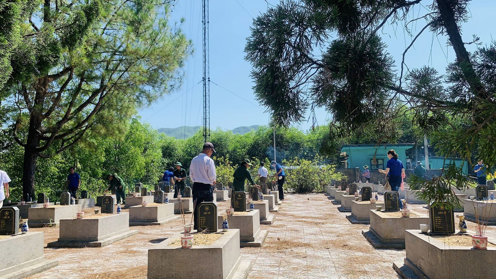 Huyện Đoàn Nam Đông phối hợp với Hội Cựu chiến binh huyện và Viettel Nam Đông thực hiện công trình thay hoa mới tại các phần mộ liệt sỹ và vệ sinh khuôn viên Nghĩa trang liệt sỹ huyện