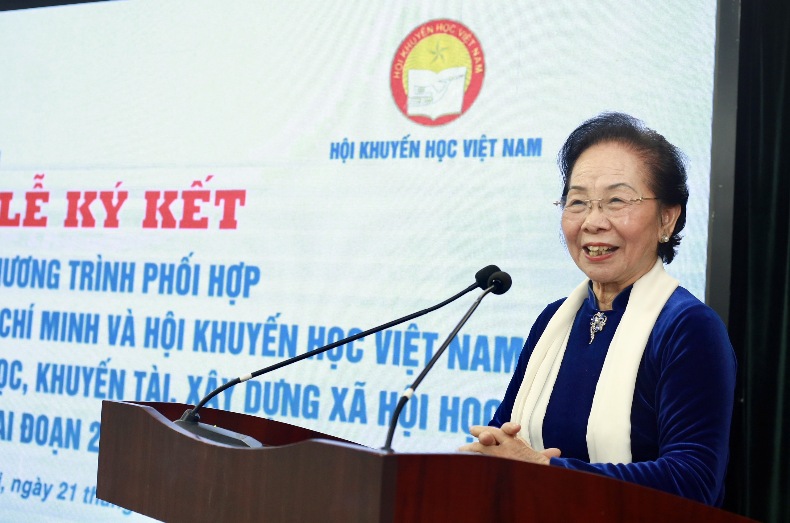 GS.TS Nguyễn Thị Doan - Nguyên Ủy viên Trung ương Đảng, Nguyên Phó Chủ tịch nước Cộng hòa xã hội chủ nghĩa Việt Nam, Chủ tịch Trung ương Hội Khuyến học Việt Nam phát biểu tại buổi lễ