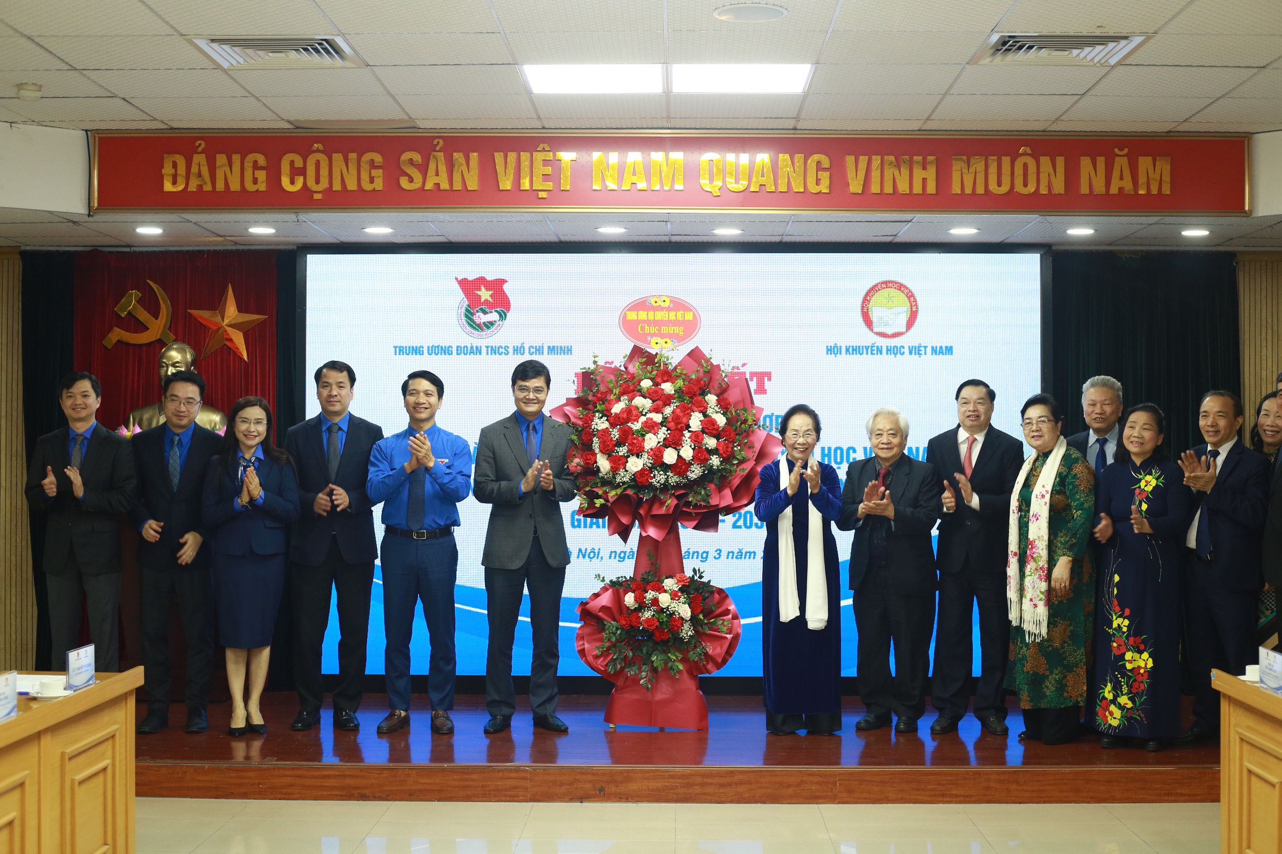 GS.TS Nguyễn Thị Doan - Nguyên Ủy viên Trung ương Đảng, Nguyên Phó Chủ tịch nước Cộng hòa xã hội chủ nghĩa Việt Nam, Chủ tịch Trung ương Hội Khuyến học Việt Nam cũng các đồng chí lãnh đạo Hội Khuyến học Việt Nam tặng hoa chúc mừng Ban Bí thư TƯ Đoàn nhân dịp kỷ niệm 93 năm ngày thành lập Đoàn TNCS Hồ Chí Minh