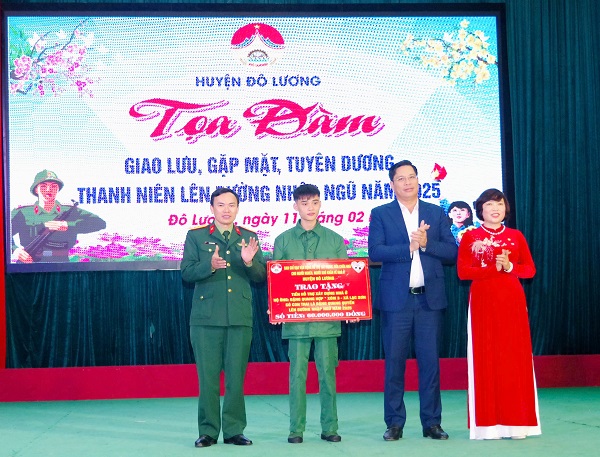 Ngày 11/02/2025 vừa qua, huyện Đô Lương tổ chức giao lưu, gặp mặt, tuyên dương thanh niên lên đường nhập ngũ 2025. Trong không khí vui tươi, phấn khởi của buổi gặp mặt, huyện Đô Lương đã trao tặng 280 suất quà, động viên thanh niên lên đường nhập ngũ năm 2025 trị giá gần 100 triệu đồng; trao tiền hỗ trợ xây dựng nhà ở trị giá 60.000.000đ cho gia đình tân binh Đặng Quang Quyết, xã Lạc Sơn; 29 suất quà mỗi suất 1 triệu đồng cho 29 tân binh có hoàn cảnh khó khăn.