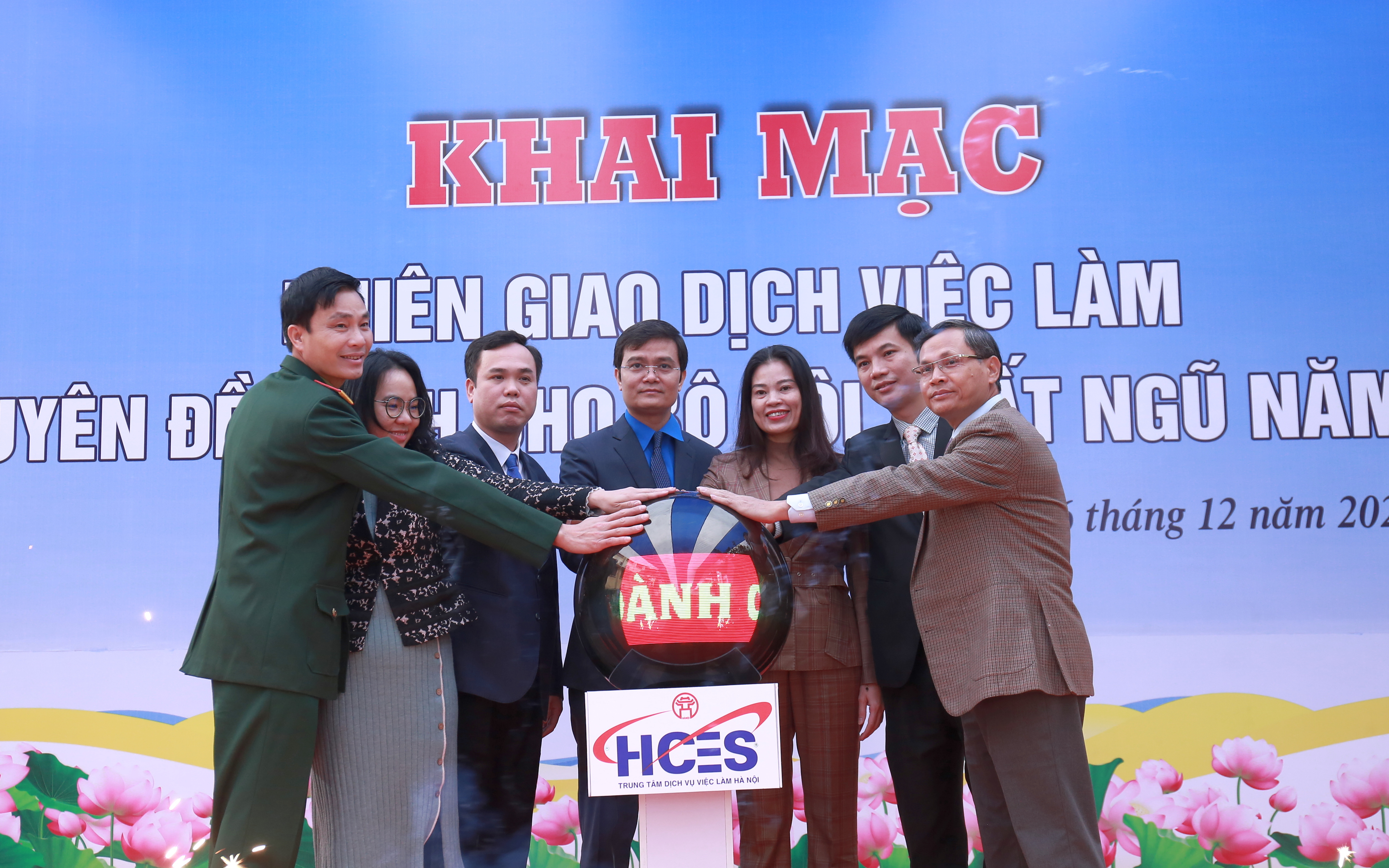 Các đại biểu bấm nút khai mạc phiên giao dịch việc làm dành cho bộ đội xuất ngũ