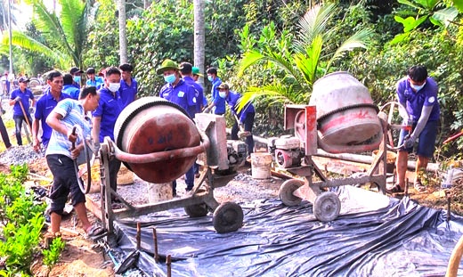 Đoàn viên thanh niên huyện Chợ Lách, tỉnh Bến Tre tham gia đổ bê-tông tuyến đường nông thôn ở tổ 3, ấp Phú Hưng, xã Hưng Khánh Trung B có chiều dài 190m, bề rộng mặt đường 3m, dày 14 cm.