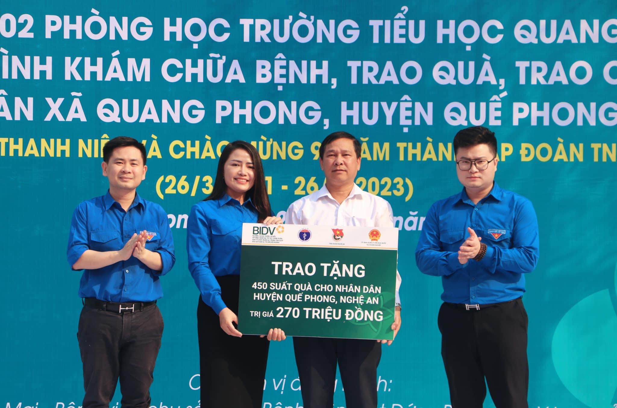 Ngày 24/3/2023 tại điểm trường bản Quyn, trường Tiểu học Quang Phong 2, huyện Quế Phong, tỉnh Nghệ An, Ban Thường vụ Tỉnh đoàn - Ban Thư ký hội LHTN Việt Nam Ban Tổ chức đã trao tặng 01 tủ sách trí tuệ, 450 phần quà đến các em học sinh tại trường Tiểu học Quang Phong 2 và nhân dân xã Quang Phong, 300 lá cờ Tổ quốc và 300 ảnh Bác Hồ cho các gia đình thụ hưởng chương trình “vận động, hỗ trợ xây dựng, sửa chữa nhà cho người nghèo, người có khó khăn về nhà ở trên địa bàn tỉnh Nghệ An” tại huyện Quế Phong