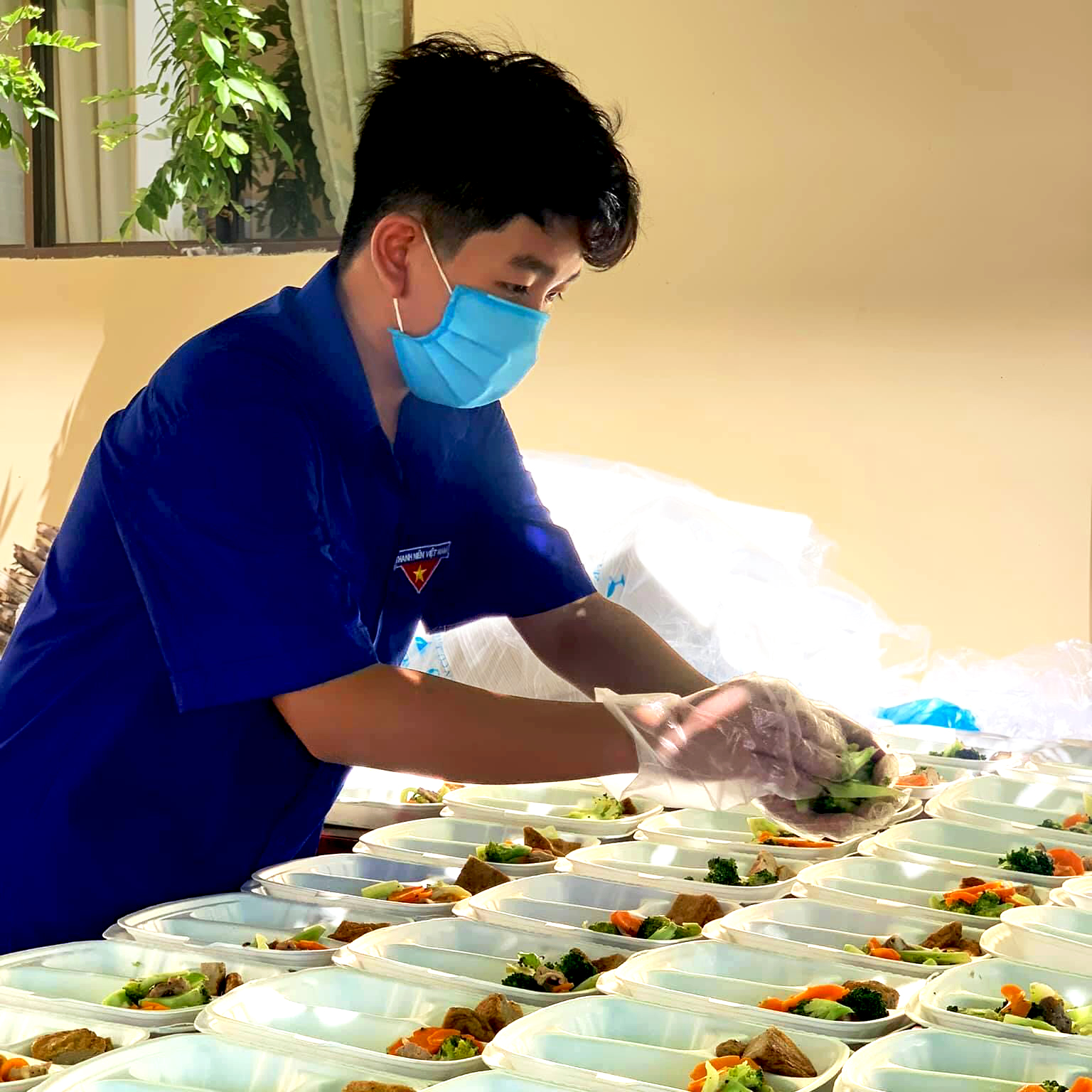 Công việc hằng ngày của các em là phụ giúp các bác, các anh chị nhặt rau, rửa rau, làm mắm, bưng thức ăn, cho cơm và thức ăn vào hộp... Em Huỳnh Ngọc Ánh Quốc nhỏ tuổi nhất trong nhóm, chỉ mới 12 tuổi, nhưng thạo việc không kém gì các anh lớn tuổi. Quốc bảo nghỉ hè gặp đúng thời điểm dịch bệnh bùng phát nên chỉ biết ở nhà. Khi nghe thông tin các anh chị Đoàn xã kêu gọi tình nguyện viên, em nảy sinh ý định xin vào phụ giúp các bác, các anh chị nấu ăn giúp người cách ly tập trung có những bữa ăn ngon.