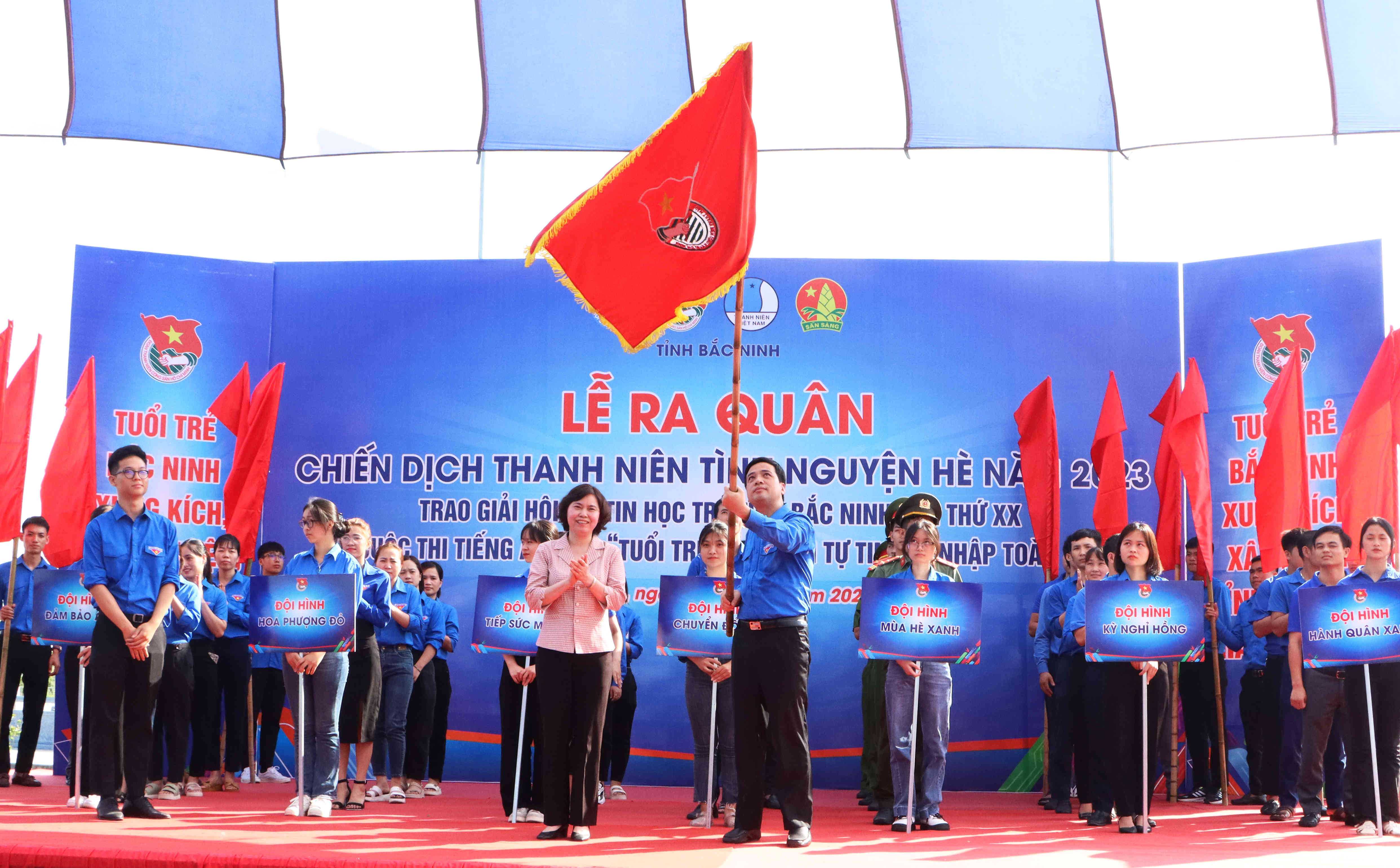 Đồng chí Trần Thị Hằng, UV Ban Thường vụ Tỉnh ủy, Phó Chủ tịch Thường trực HĐND tỉnh trao cờ lệnh ra quân Chiến dịch Thanh niên tình nguyện Hè năm 2023 cho Bí thư tỉnh Đoàn Bắc Ninh Nguyễn Đức Sâm