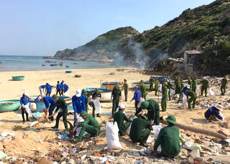 Đoàn viên thanh niên và các cán bộ, chiến sỹ bộ đội biên phòng tham gia vệ sinh môi trường biển