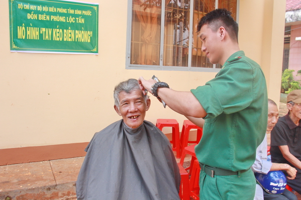 Các “tay kéo Biên phòng” tình nguyện cắt tóc cho người dân tại chương trình “Chia sẻ yêu thương - Nghĩa tình biên giới”