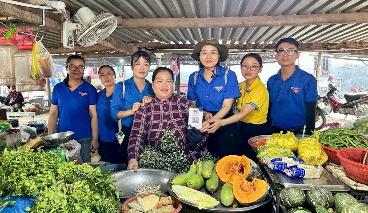 Đoàn viên thanh niên hỗ trợ người dân thanh toán bằng QR code