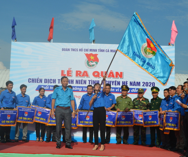 Đ/c Lưu Văn Vĩnh - Phó Trưởng Ban Dân vận Tỉnh ủy trao cờ xuất quân cho đồng chí Nguyễn Hồng Thắm - Phó Bí thư Tỉnh đoàn, Phó trưởng Ban Thường trực Ban Chỉ đạo Chiến dịch Thanh niên tình nguyện hè năm 2020.