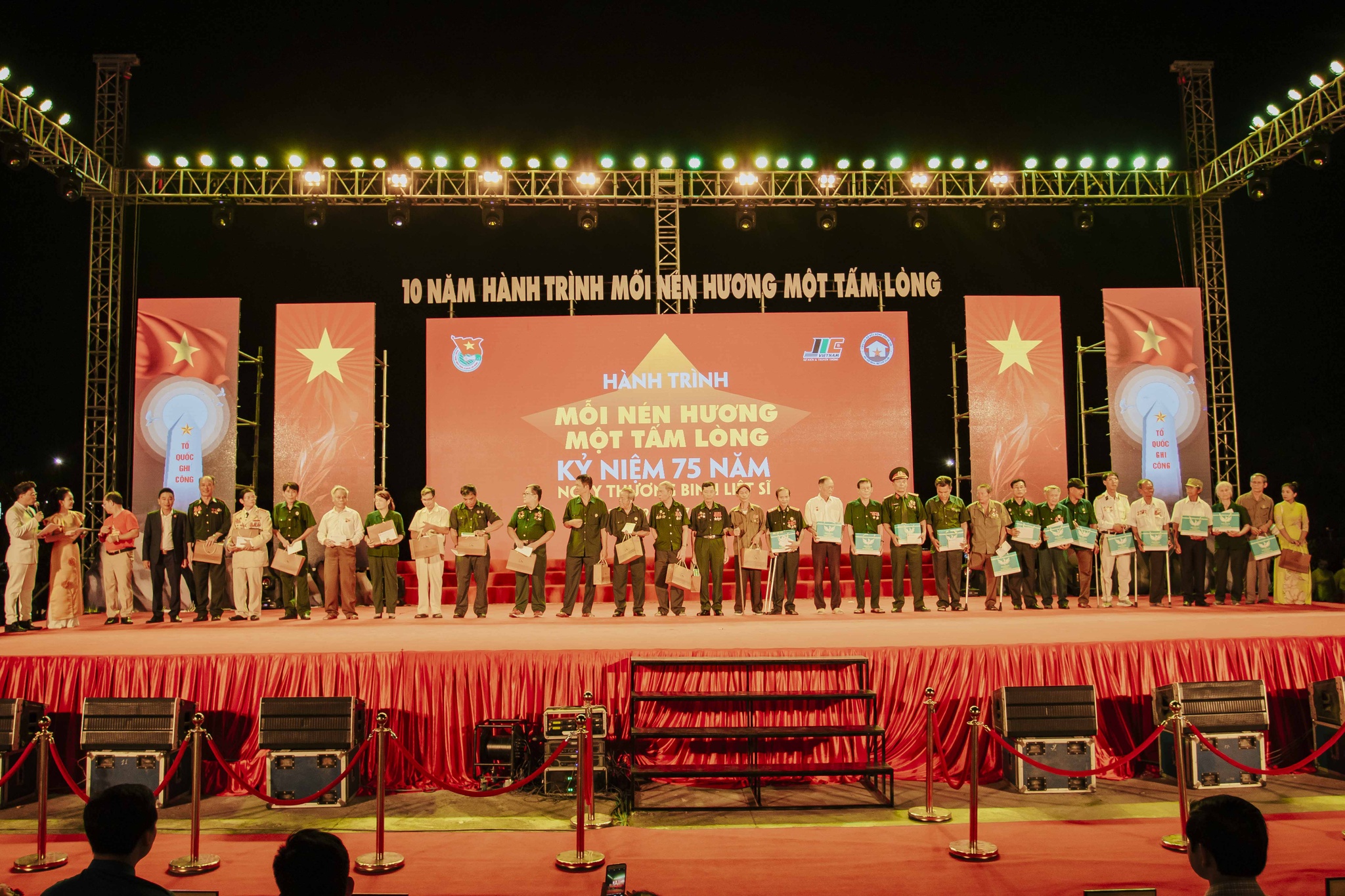 Trong khuôn khổ chương trình, Ban Tổ chức đã trao tặng sổ tiết kiệm cho 10 Mẹ Việt Nam anh hùng, mỗi sổ trị giá 5 triệu đồng; tặng quà cho đại diện 33 gia đình thương, bệnh binh có hoàn cảnh khó khăn tại các địa phương trong tỉnh gồm tiền mặt 500.000đ cùng các phần quà từ nhà tài trợ. Ban Tổ chức chương trình cũng đã vinh danh 14 tập thể, cá nhân có những đóng góp trong công cuộc tuổi trẻ phát huy truyền thống yêu nước, đã cùng nhau viết lên ý tưởng thực hiện 10 năm “Hành trình mỗi nén hương một tấm lòng”.