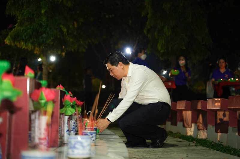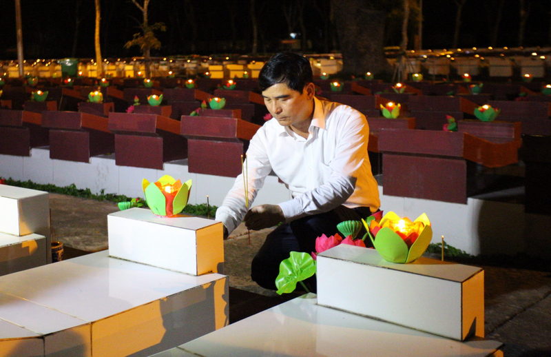 Trong không khí trang nghiêm, xúc động, các đồng chí lãnh đạo tỉnh cùng đông đảo đoàn viên, thanh thiếu nhi, nhân dân địa phương đã dâng hoa, thắp hương và thắp lên 9.000 ngọn nến tri ân các anh hùng liệt sĩ.