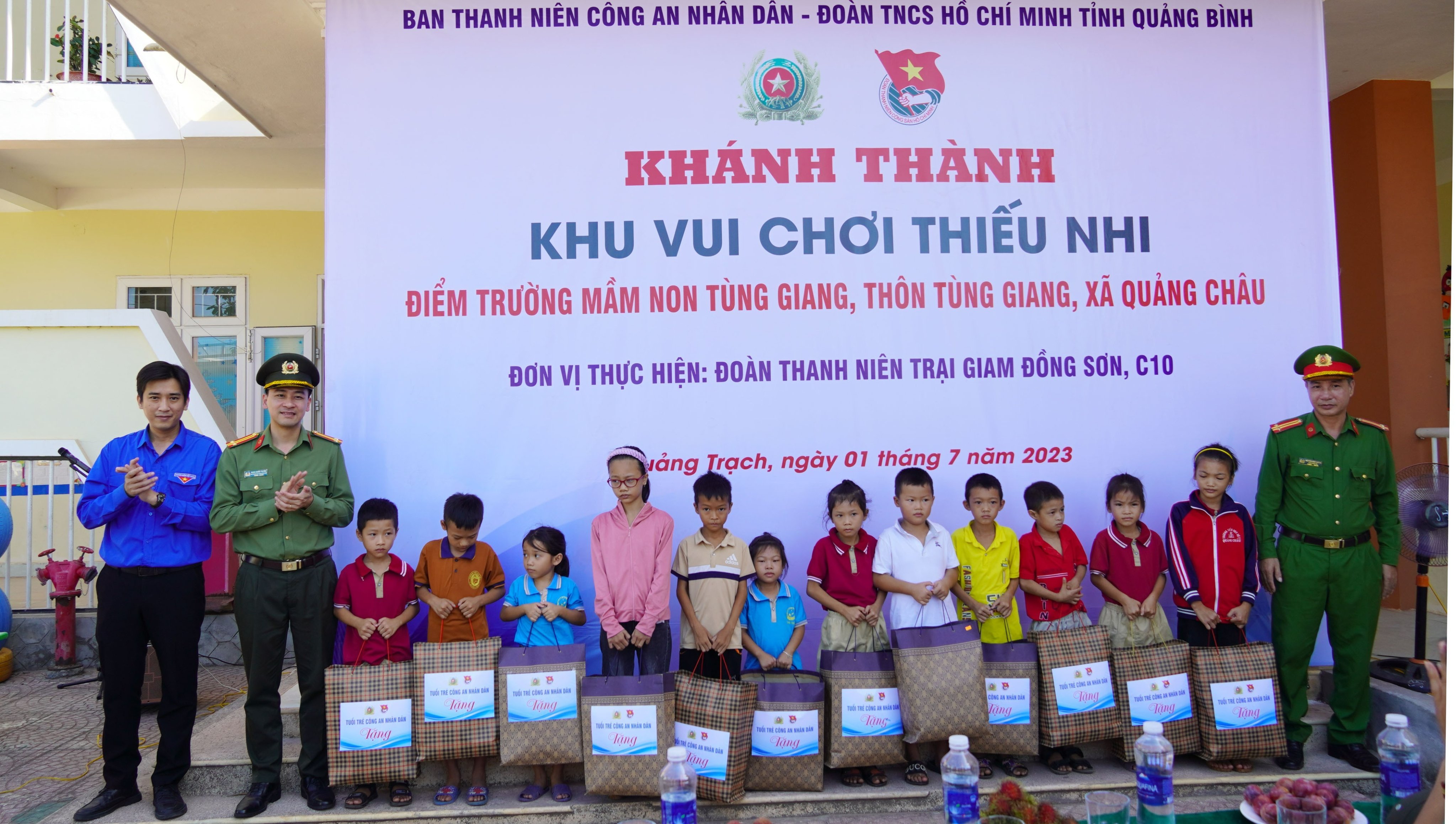 Tại huyện Quảng Trạch, đoàn đã khánh thành sân chơi thiếu nhi trị giá 30 triệu đồng. Đây là món quà ý nghĩa dành cho các cháu học sinh điểm trường mầm non Tùng Giang, xã Quảng Châu, là địa phương còn nhiều khó khăn. Dịp này, đoàn cũng đã tặng quà cho 20 em học sinh nghèo vượt khó.