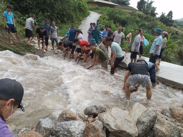 ĐVTN chung tay san đất do mưa lớn sạt xuống đường bê tông