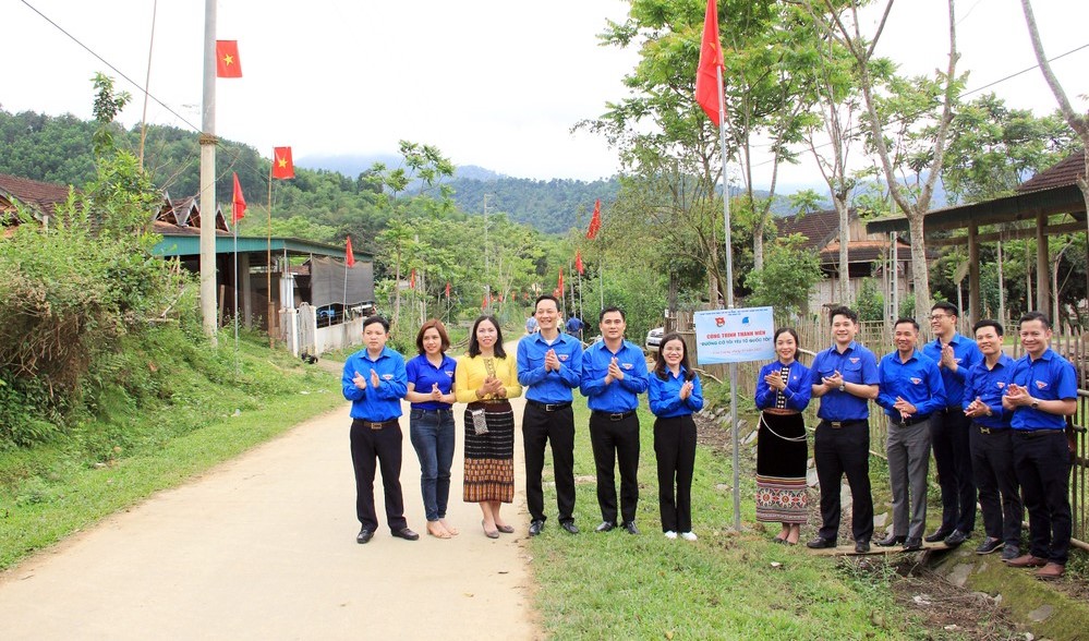 Đại diện Tỉnh đoàn Hưng yên và Tỉnh đoàn Nghệ An tại công trình thanh niên đường cờ “Tôi yêu Tổ quốc tôi” do Tỉnh đoàn Hưng Yên trao tặng xã Châu Khê, huyện Con Cuông. Ảnh: Thanh Quỳnh |