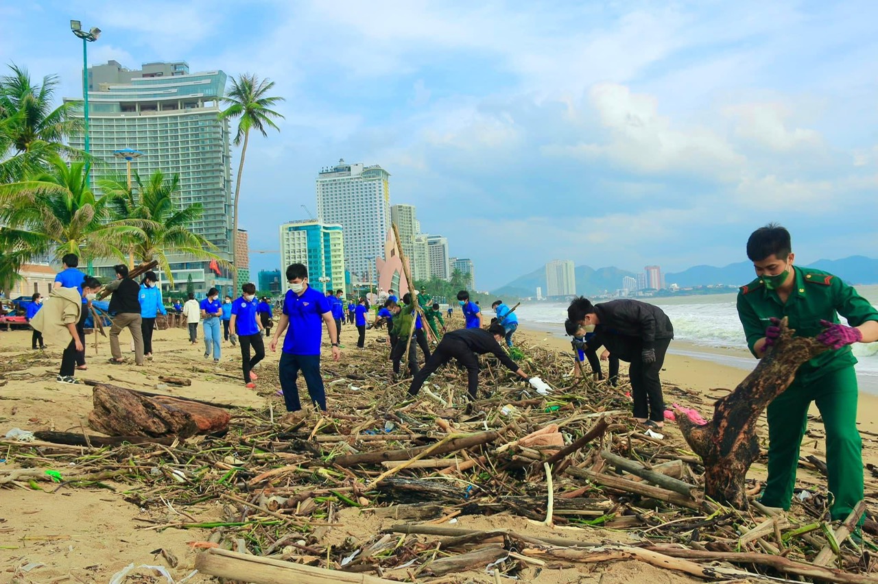 Đoàn viên, thanh niên thu dọn rác và cây gỗ bị lũ cuốn trôi, khắc phục hiện trạng môi trường tại bờ biển TP. Nha Trang
