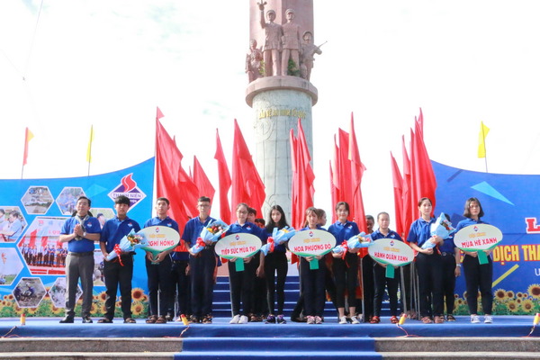 Đồng chí Lâm Quốc Toàn, Phó Bí thư Tỉnh đoàn, Chủ tịch Hội LHTN Việt Nam tỉnh, Chỉ huy trưởng Ban Chỉ huy Chiến dịch cấp tỉnh tặng hoa cho các đội hình tình nguyện
