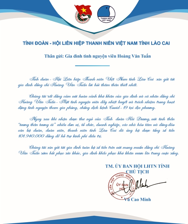 Bức thư của Tỉnh đoàn – Hội LHTN Việt Nam tỉnh Lào Cai gửi gia đình tình nguyện viên Hoàng Văn Tuấn.