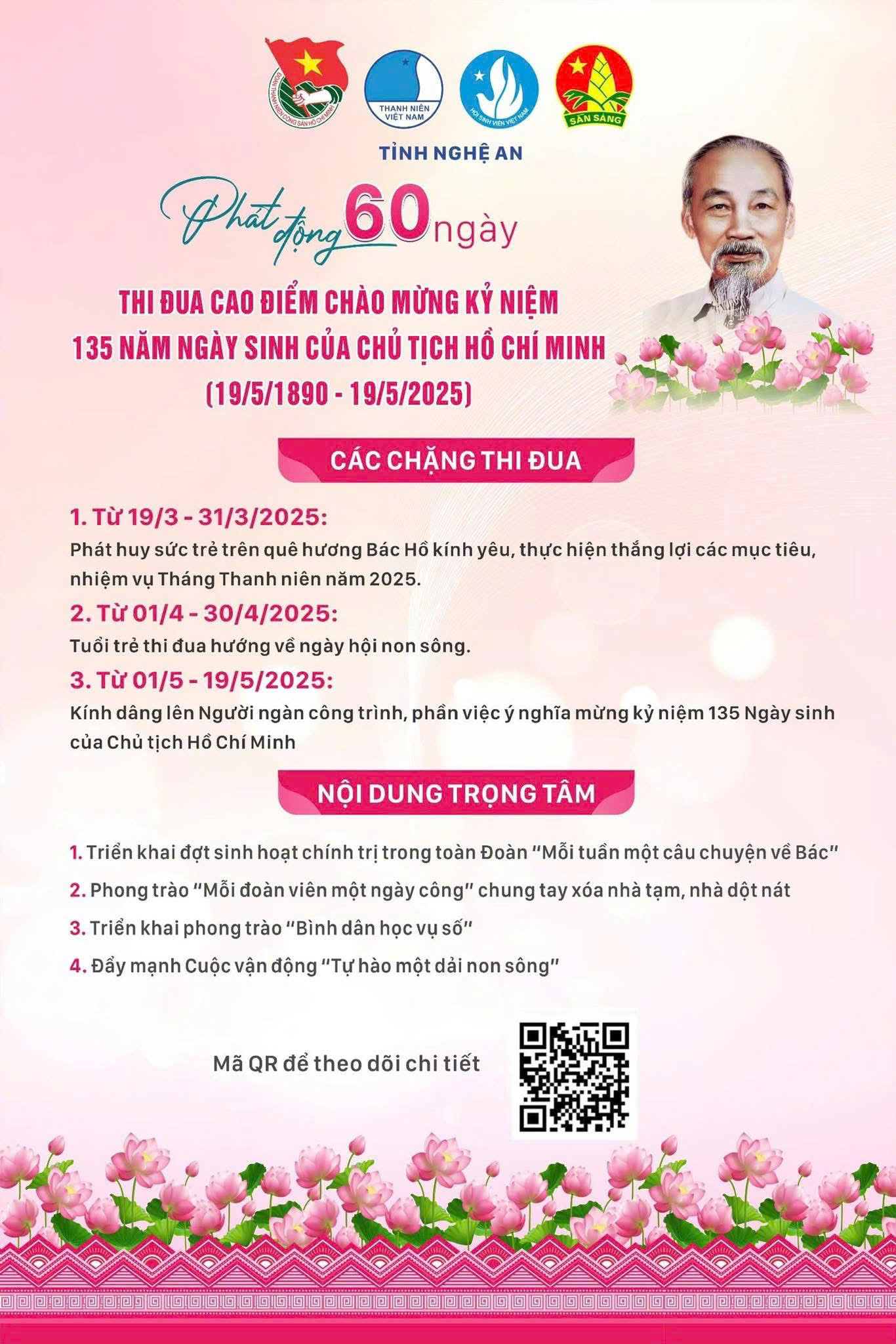 Trong 60 ngày thi đua, có 4 hoạt động, phong trào lớn được triển khai: đợt sinh hoạt chính trị trong toàn Đoàn “Mỗi tuần một câu chuyện về Bác”; phong trào “Tuổi trẻ Nghệ An chung tay xóa nhà tạm, nhà dột nát”; triển khai phong trào “Bình dân học vụ số”; đẩy mạnh Cuộc vận động “Tự hào một dải non sông”.