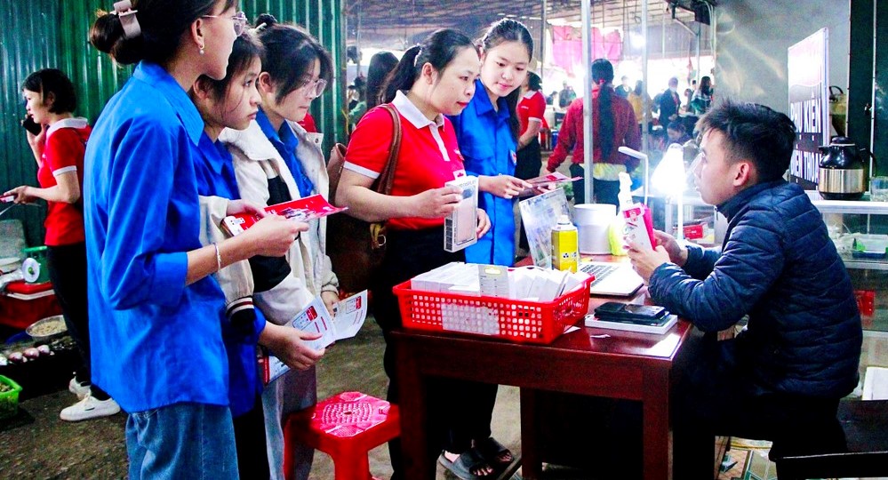 Tuổi trẻ Yên Thành ra quân tư vấn chuyển đổi số cho tiểu thương lại chợ thị trấn. Ảnh: PV |
