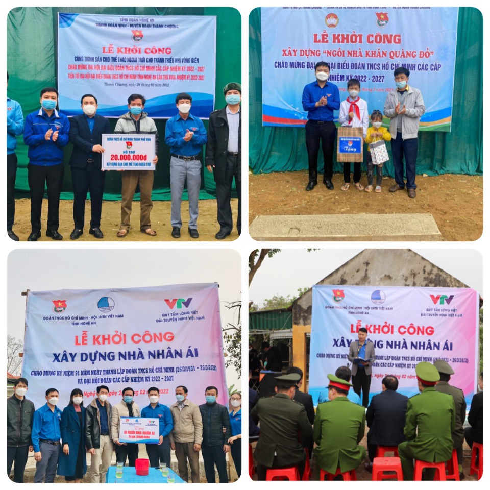 Hỗ trợ xây dựng nhà nhân ái cho các gia đình chính sách, gia đình có hoàn cảnh khó khăn. Ảnh: Huyện đoàn Nghi Lộc, Tân Kỳ, Thanh Chương