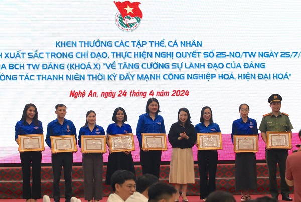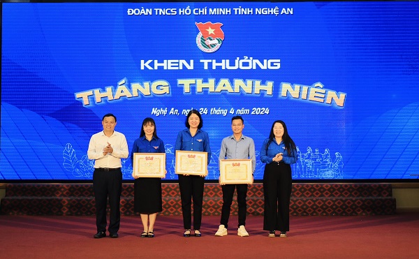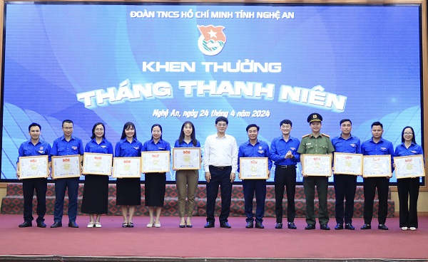 Tại hội nghị, đã tiến hành trao tặng bằng khen của T.Ư Đoàn cho 1 tập thể và 3 cá nhân đã có thành tích xuất sắc trong công tác tuyên truyền hoạt động Tháng Thanh niên năm 2024; 8 tập thể và cá nhân đã vinh dự nhận được bằng khen của Ban Thường vụ Tỉnh ủy vì đã có thành tích xuất sắc trong chỉ đạo, thực hiện Nghị Quyết 25 của Ban Chấp hành T.Ư Đảng. Ngoài ra, Ban Thường vụ Tỉnh Đoàn Nghê An cũng đã tặng bằng khen cho 41 tập thể, 77 cá nhân vì “Đã có thành tích xuất sắc trong tổ chức các hoạt động Tháng Thanh niên năm 2024”; Khen thưởng cho 4 tập thể và 6 cá nhân thuộc Hội LHTN Việt Nam tỉnh Nghệ An vì “Đã có thành tích xuất sắc trong Chương trình mùa Đông ấm năm 2023 và Xuân tình nguyện năm 2024”.