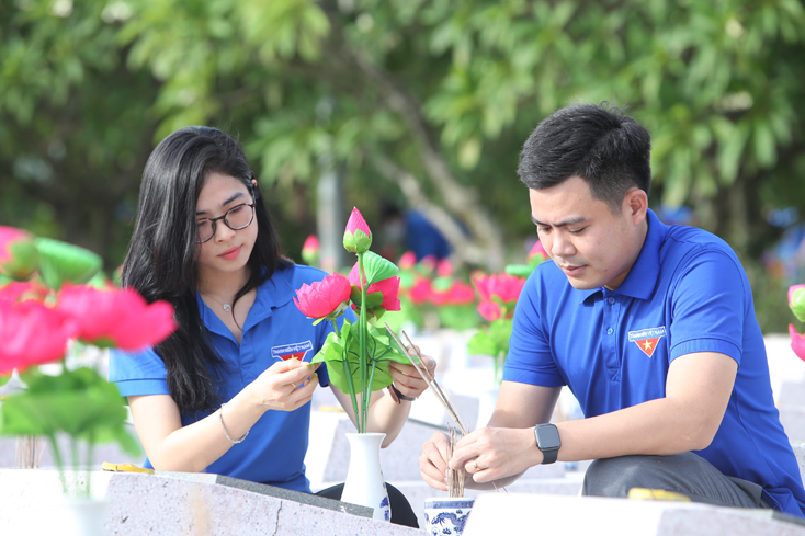 Tại Nghĩa trang Liệt sĩ Ba Dốc (Bố Trạch) hàng trăm đoàn viên, thanh niên cùng nhau dọn dẹp cảnh quan nghĩa trang, chăm sóc, làm vệ sinh những phần mộ, lắp đặt lọ hoa sứ, hoa sen lụa để khuôn viên nghĩa trang sạch đẹp, nghiêm trang và ấm cúng hơn.