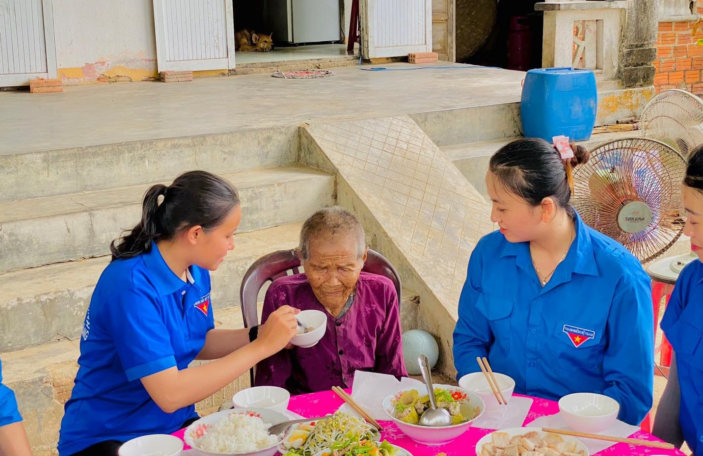 "Bữa cơm tri ân" tại nhà mẹ Việt Nam Anh hùng Cao Thị Chánh, 99 tuổi tại thôn Hiền Lương, xã Nghĩa Hà, thành phố Quảng Ngãi.